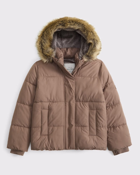 Our ultra puffer in a wind- and water-resistant fabric, featuring super soft faux fur interior lining and collar, on-trend quilting details, hood with detachable faux fur trim, recycled fill, logo jocktag at sleeve, zip- and snap-up front, side pockets and storm cuffs. Imported.