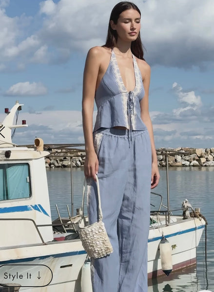 The April Top is your new warm-weather essential that is light and effortless thanks to our airy linen blend fabric. This tailored top features a halter neckline and tie-front bodice that lets you adjust for the perfect fit. Princess seams shape the front for a feminine silhouette, while the smocked back panel offers comfort and ease. The novelty shell print along the seams brings a beachy feel. Pair it with the matching Sur Pants or switch things up with high-rise denim.