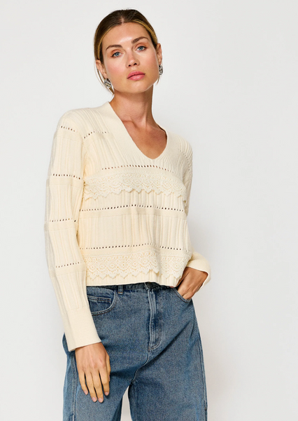 - Mid-weight knit sweater fabric- V-neckline- Lace trim detailed- Long sleeves with ribbed cuffs- Pullover design, no closure