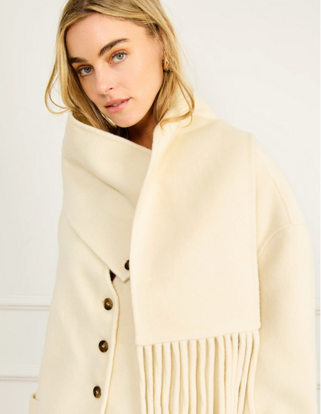 - Mid-weight, non-stretch wool weave- Front button closure- Love sleeves- Welt front pockets- Detachable scarf- Unlined