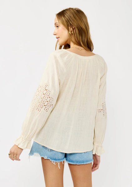 Meet your new boho favorite—our ultra-flowy peasant blouse, crafted from a dreamy rayon and linen blend for a cool, breathable feel. Featuring long sleeves with pretty embroidered lace details, ruffled elastic cuffs, and a split v-neckline with ties. Tuck it into your favorite denim for an effortless boho ensemble that feels as timeless as it looks.