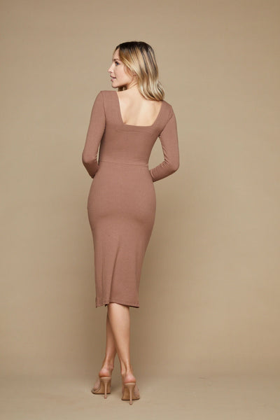 Product Details: Made in Los Angeles. Long sleeve rib dress with high slit. This is the perfect mocha colored dress! It is a timeless piece that can be worn many different ways all year round. Dress it down with flats or dress up with boots or heels.