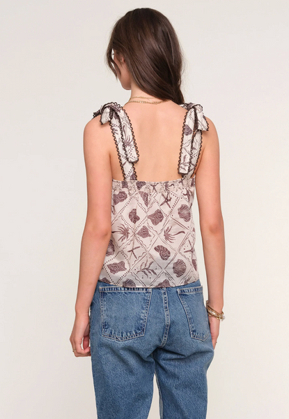 The Almeria Top is a pretty, lightweight top, adorned with our favorite summer print. It features a relaxed fit, scalloped trim, and tie straps.