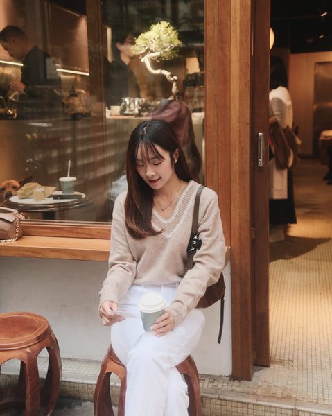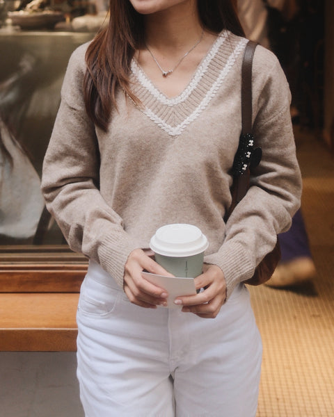 Basic v neck long sleeves sweater. Model in BEIGE/IVORY is 5'8" and in WILD GREY/IVORY is 5'9". They are wearing size Small.