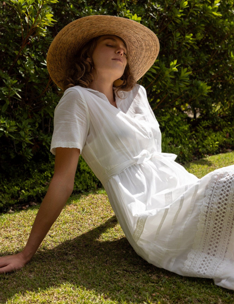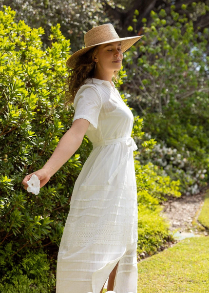 A timeless white midi shirt dress adorned with delicate lace accents.
