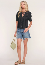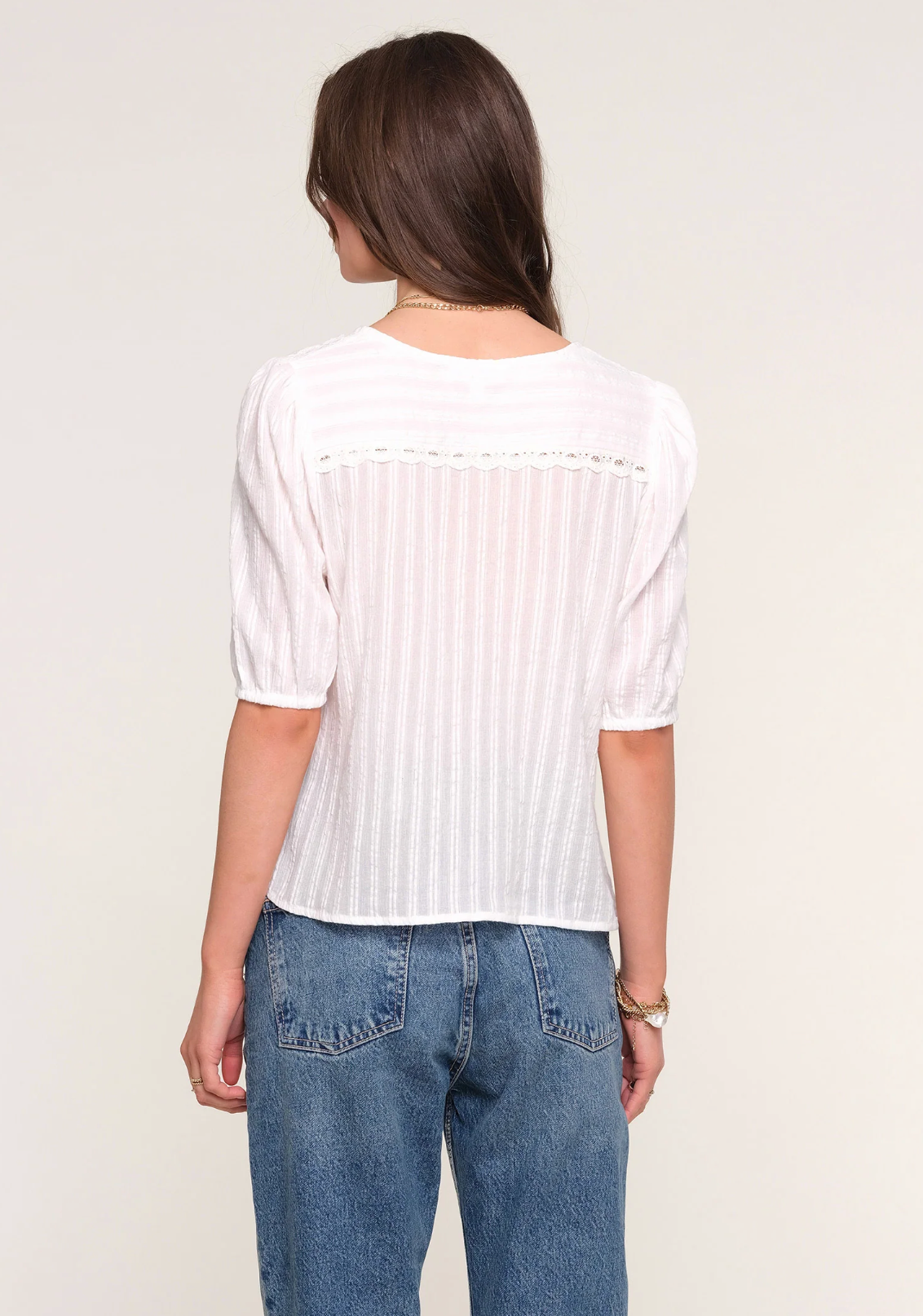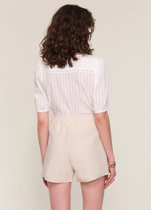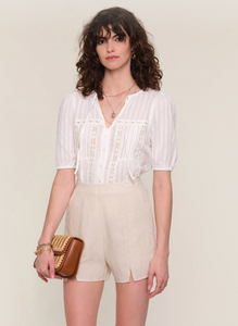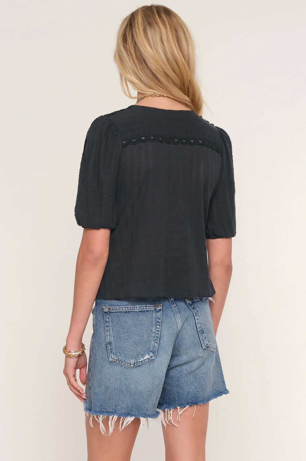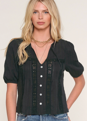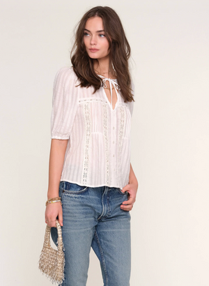 Inspired by vintage blouses, the Shanna Top is a breezy summer top. Made from a washed cotton voile it features a tie neck and lace insets.